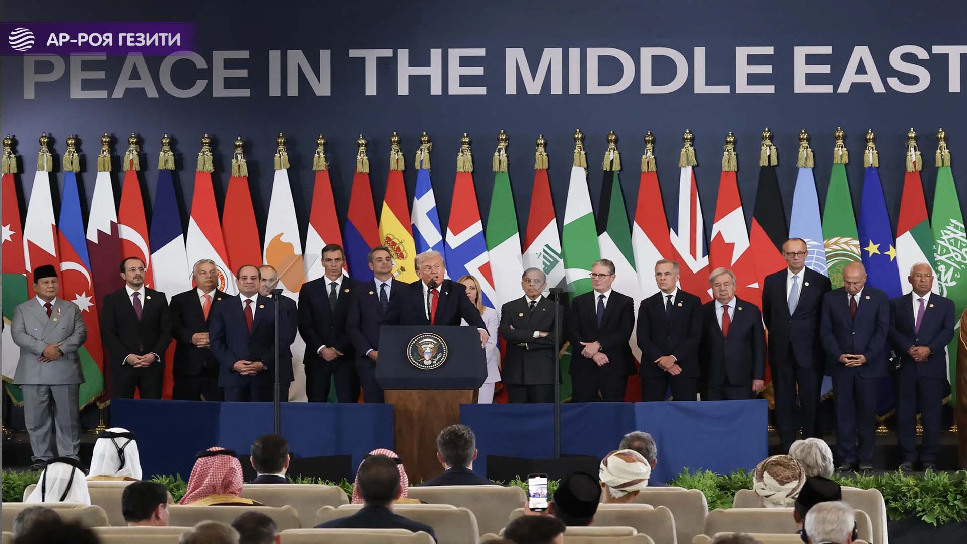Трамп «Газага байланыштуу согуш аяктады» деп жарыялап, ХАМАС кыймылы «куралды тапшырат, болбосо ага катуу чара көрүлөт» деген сөзүн кайталады. Ал ошондой эле яхудий түзүмүнө кыйыр ишарат кылып, «ХАМАСты жок кылуу үчүн Газага аскер жөнөтүү зарыл деп ойлобойм» деди. Мындан тышкары, «бир нече мамлекет Газа үчүн куткаруу пакети катары 7 миллиард доллардан ашык каражат бөлгөнүн» айтып, Газаны кайра куруу үчүн ири салымдар жарыяланганын, алардын ичинде бир гана АКШ тарабынан 10 миллиард доллар бөлүнгөнүн билдирди.