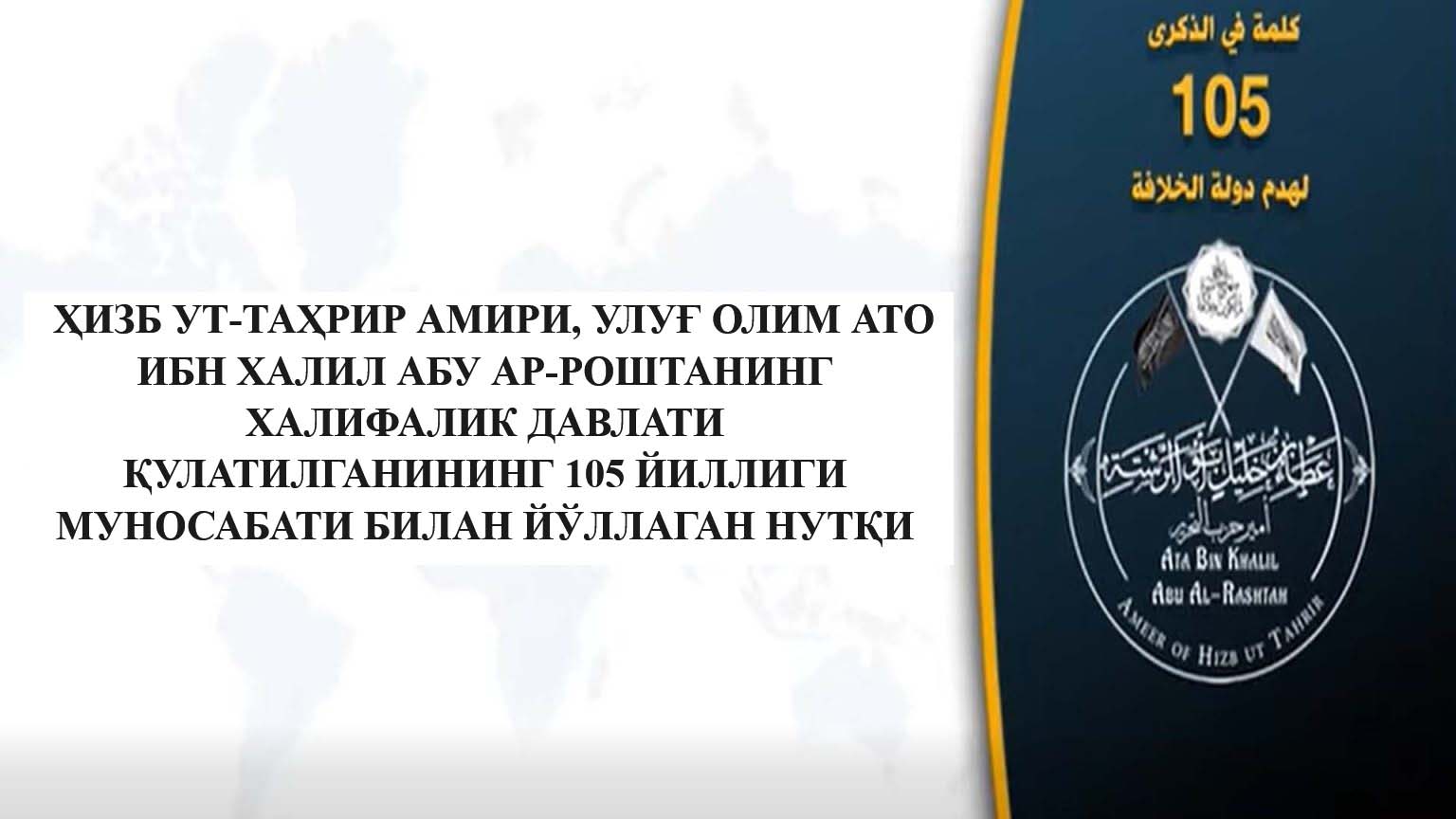 ҲИЗБ УТ-ТАҲРИР АМИРИ, УЛУҒ ОЛИМ АТО ИБН ХАЛИЛ АБУ АР–РОШТАНИНГ ХАЛИФАЛИК ДАВЛАТИ ҚУЛАТИЛГАНИНИНГ 105 ЙИЛЛИГИ МУНОСАБАТИ БИЛАН ЙЎЛЛАГАН НУТҚИ